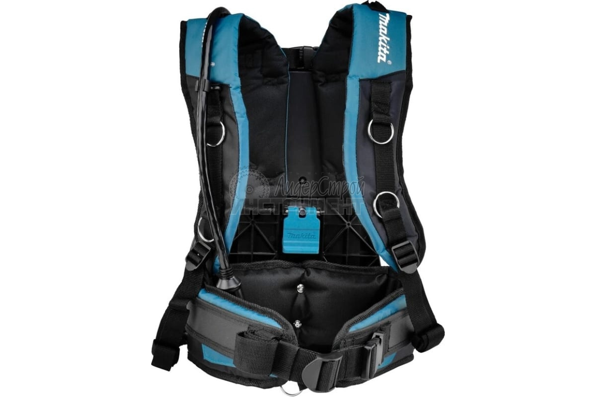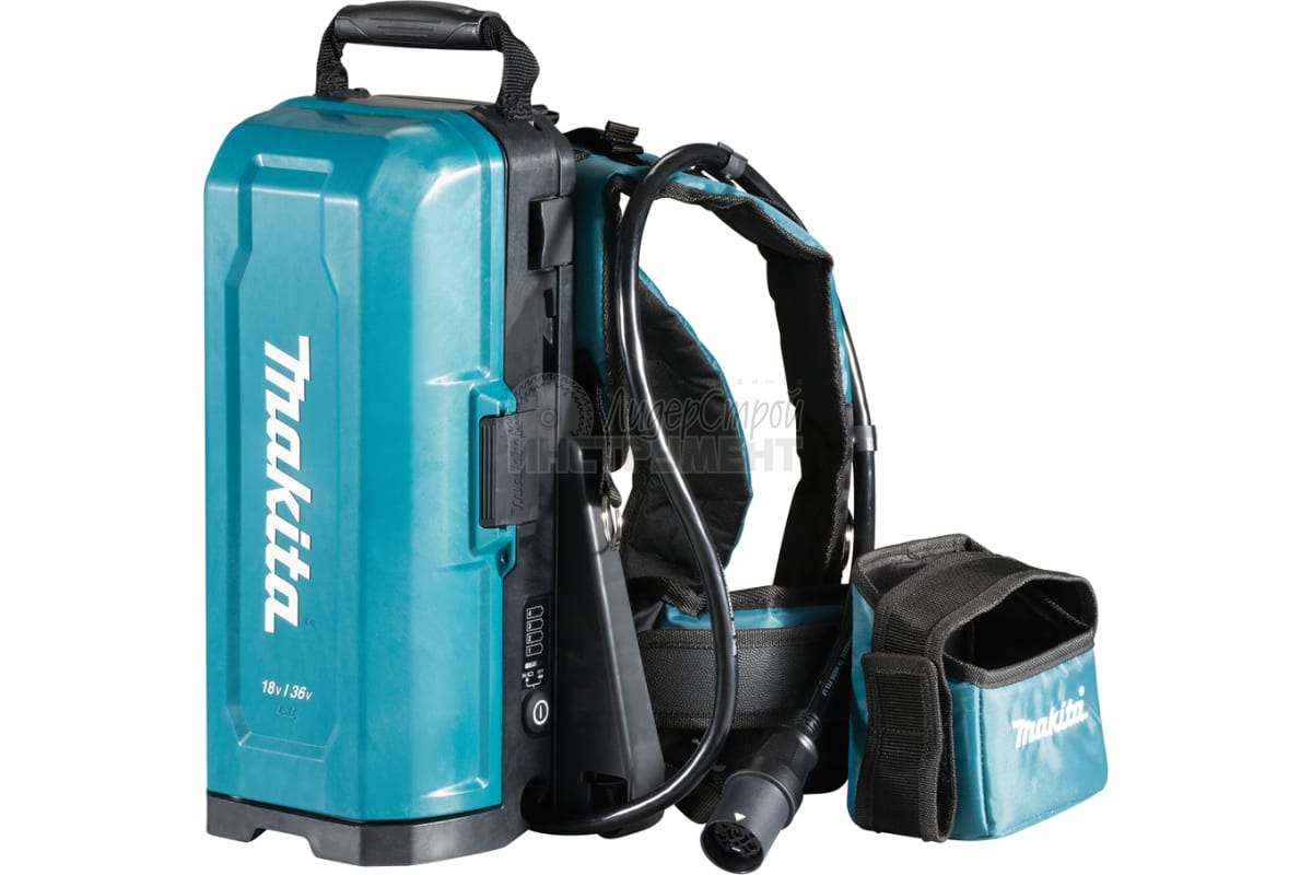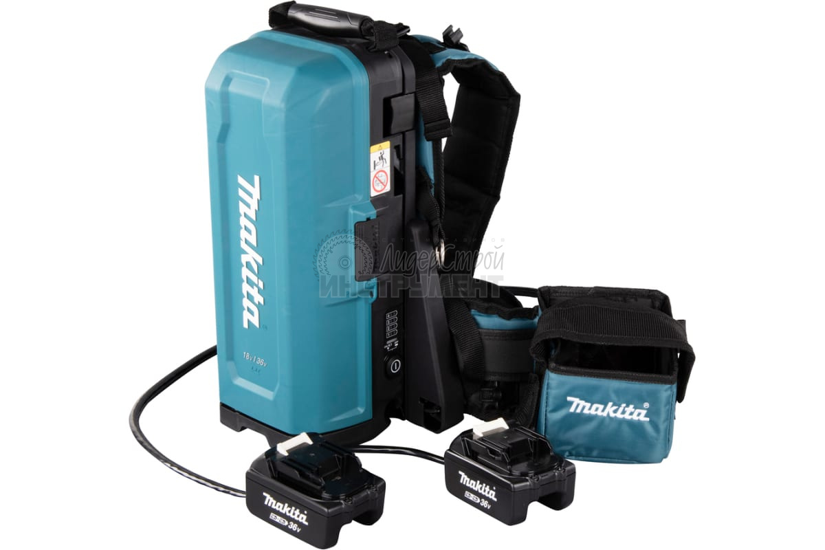 Makita разработала аккумуляторную станцию, которую вы носите как рюкзак (вес 1,7 кг) эта аккумуляторная станция содержит четыре отдельных батареи LXT, и они снова подходят для 250 машин. Жгут регулируется и поэтому всегда подходит. Аккумуляторы подключаются к машине с помощью кабеля и адаптера.