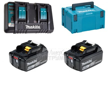 в комплекте поставляется 2 литий-ионных аккумулятора: BL 1850B 18В емкостью 5 Ач, BL 1021B 12В емкостью 2,0 Ач и двухпортовая зарядная станция.