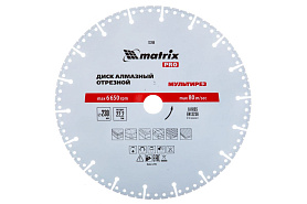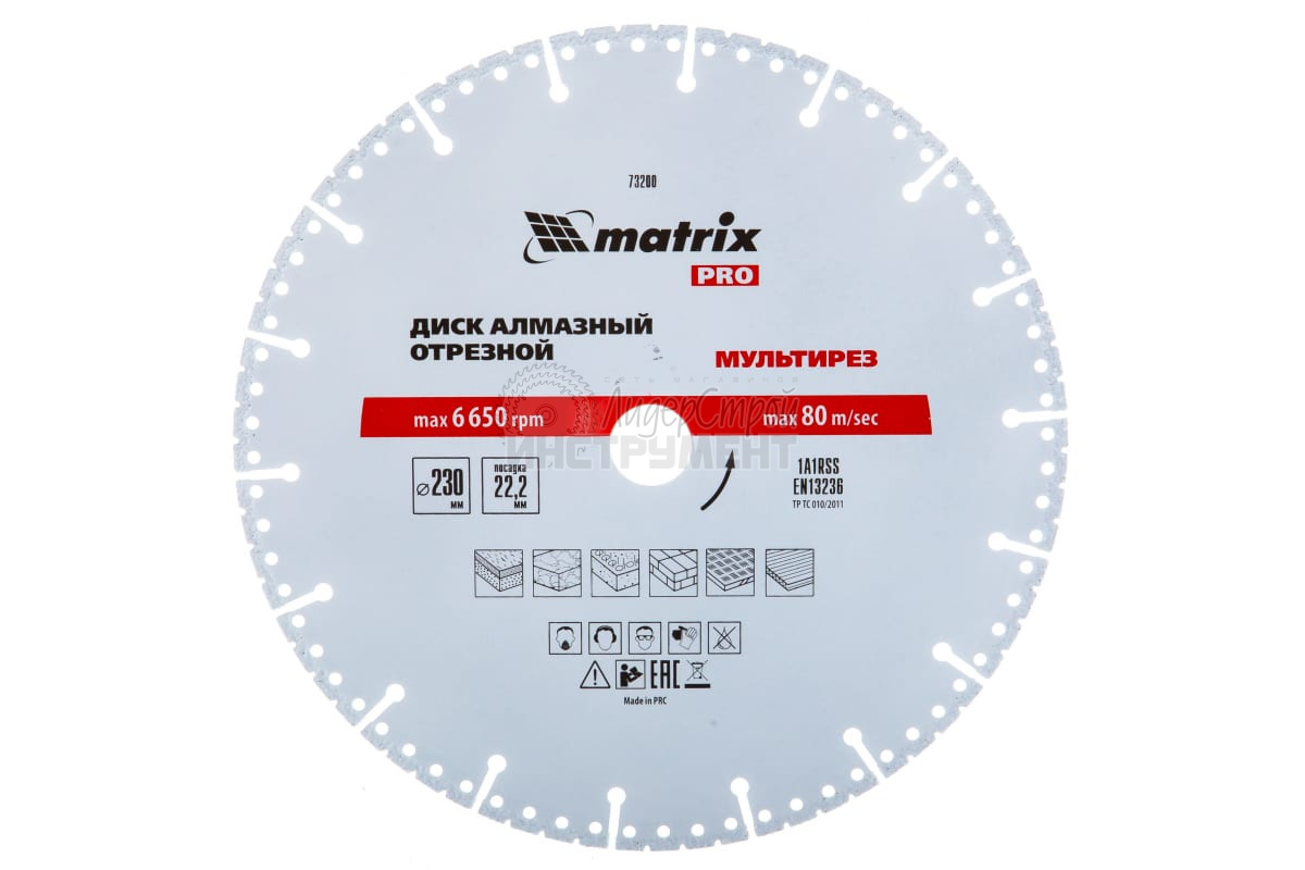 Алмазный отрезной диск Matrix PRO Мультирез 73200, 230 х 22,2 мм, применяется для сухого и мокрого резания бетона любой твердости, железобетона, гранита, кирпича, металла, древесины, пластика и других материалов. Используется в качестве универсального режущего инструмента в профессиональной сфере, например, строительными, специальными службами, сотрудниками МЧС. К работе с диском необходимо приступать после ознакомления с руководством пользователя.