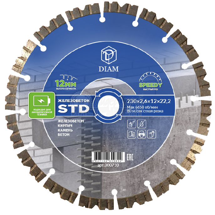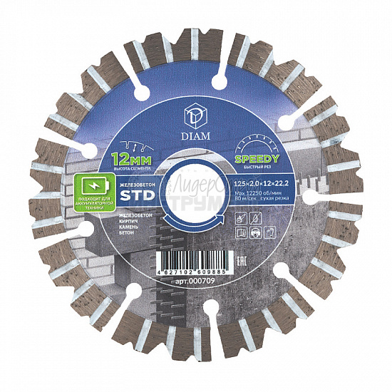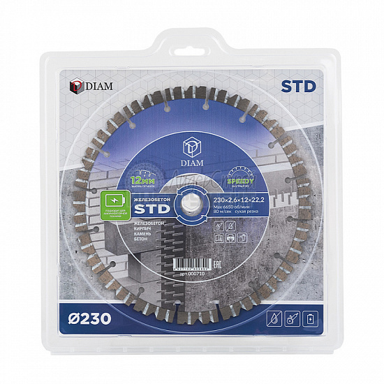 Алмазный диск Diam Железобетон STD - сегментный алмазный диск с лазерной сваркой сегментов диаметром 125, 230 и 350 мм. Предназначен для резки железобетона, бетона, кирпича и камня.