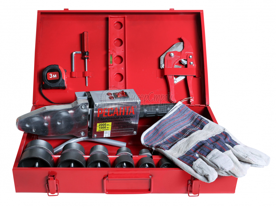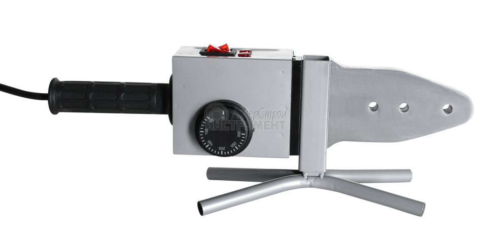 Прибор используется для сварки труб различного диаметра из большинства полимерных материалов. Он надежно соединяет конструкции без протечек в месте шва. Сварка выполняется в месте стыка и не требует применения дополнительных деталей. Насадки имеют антипригарное тефлоновое покрытие, обеспечивающее долгий срок службы. Аппарат оснащен индикатором подключения к сети и контроля температуры. Также предусмотрена подставка, на которую можно установить прибор при перерывах в работе. Есть удобный и вместительный металлический кейс.