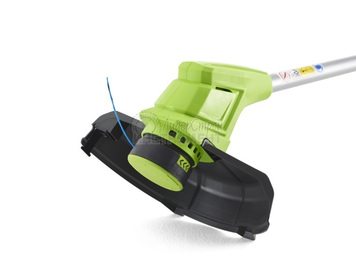 Ширина скашивания – 30 см, катушка имеет односторонний вывод лески 1,65 мм с автоподачей. Время автономной работы от 2 А/ч аккумулятора составляет 20 минут. Двигатель инструмента оснащен защитой от перегрузок, а для защиты от случайного включения предусмотрен специальный предохранитель. Аккумулятор, который использует этот триммер, входит в линейку устройств Greenworks G-24V и его можно использовать с более чем 20 устройствами из этой серии.
