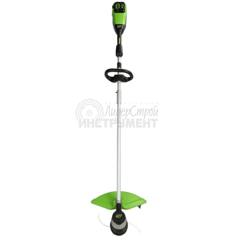 Для долговечной службы двигатель оснащается системой защиты от перегрузок. Вал от двигателя до катушки - прямой и сделан из стали, что также увеличивает срок службы триммера по сравнению с тросовой конструкцией. Модель работает от аккумуляторной батареи 60V, которая применяется и совместима со всеми устройствами из новой линейки Гринворкс 60 вольт.