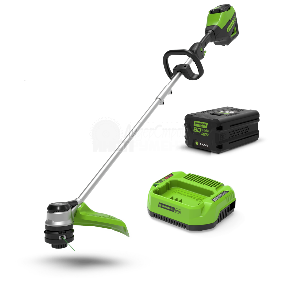Для долговечной службы двигатель оснащается системой защиты от перегрузок. Вал от двигателя до катушки - прямой и сделан из стали, что также увеличивает срок службы триммера по сравнению с тросовой конструкцией. Модель работает от аккумуляторной батареи 60V, которая применяется и совместима со всеми устройствами из новой линейки Гринворкс 60 вольт.