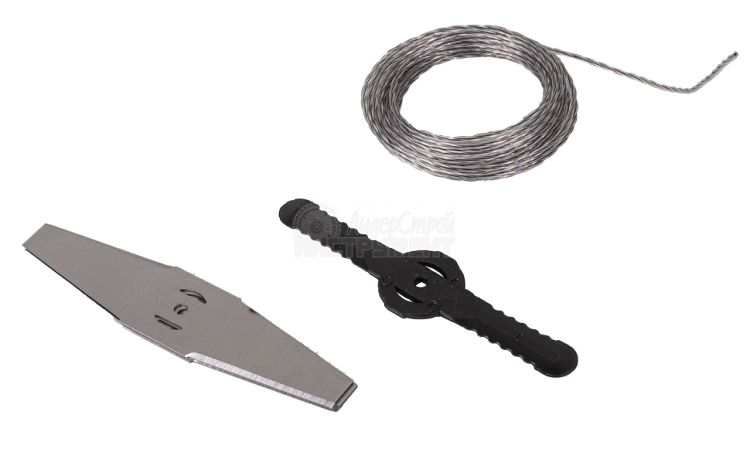 Четырехлопастной нож, входящий в комплект, качественно обрабатывает даже жесткую траву. Косильная головка с леской с легкостью достает до труднодоступных мест.