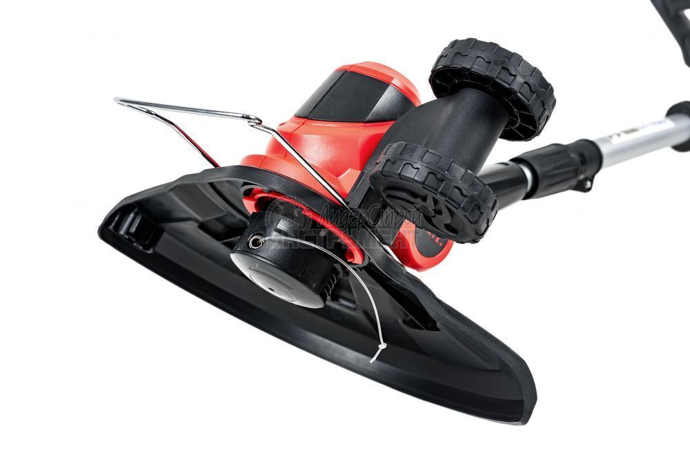 С помощью поворотной головы и дополнительных колесиков легко обкашивать края клумб, дорожек и газонов