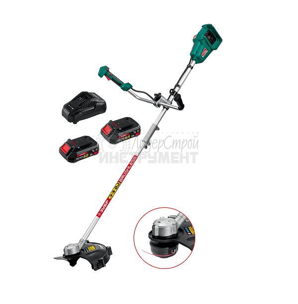 Универсальный инструмент на участке, способный заменить газонокосилку и триммер. Оснащается катушкой с леской (для мягкой растительности) и ножом (для грубой растительности). Большая мощность двигателя BRUSHLESS и две батареи позволяют косить довольно густую и грубую растительность длительное время.