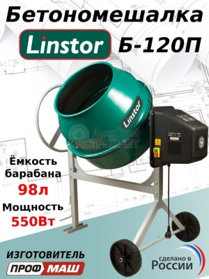 LINSTOR Б-120П — компактный и надежный бетоносмеситель, разработанный для приготовления бетонных смесей, строительных растворов и перемешивания сыпучих материалов. Благодаря мощности 550 Вт и объему барабана 98 л, он подходит как для профессиональных, так и для бытовых строительных работ.
