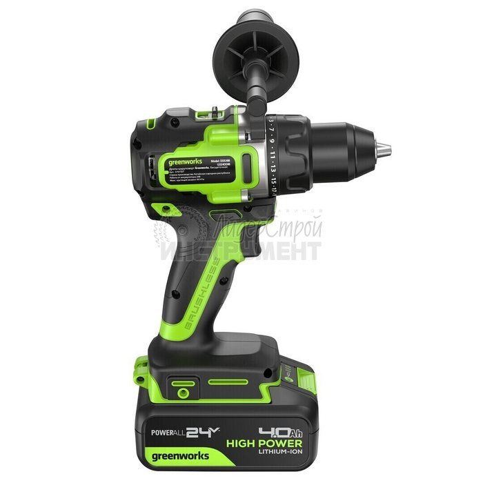 Дрель-шуруповерт аккумуляторная Greenworks GD24DD90, 24V, б/щет, 45/90Нм, 1x4Ач, ЗУ — инструмент с двумя рабочими режимами для работ в мастерской или на стройплощадке: сверление без удара и заворачивание/отворачивание метизов.