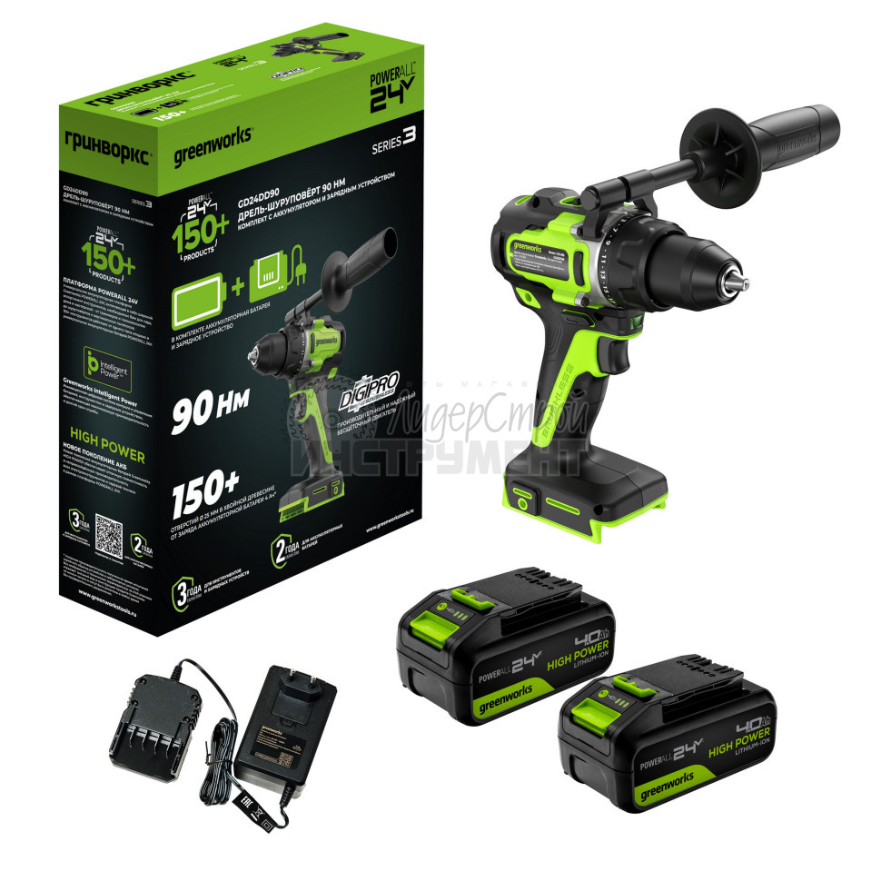 Дрель-шуруповерт аккумуляторная GREENWORKS GD24DD90 2х4Ah 3707507CUD (отзывы)
