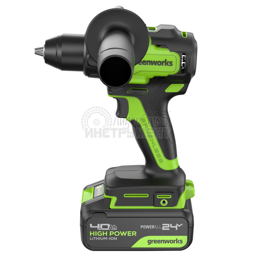 Дрель-шуруповерт аккумуляторная Greenworks GD24DD90, 24V, б/щет, 45/90Нм, 2x4Ач, ЗУ — инструмент с двумя рабочими режимами для работ в мастерской или на стройплощадке: сверление без удара и заворачивание/отворачивание метизов.