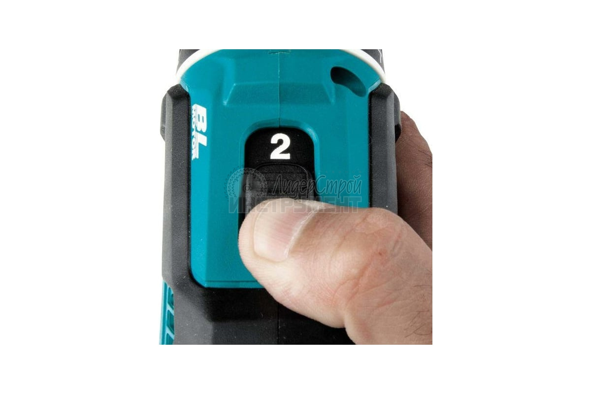 Управляется дрель-шуруповерт Makita DDF485RFE традиционно – при увеличении давления на курок скорость возрастает от нуля до максимума. Предельное значение скорости устанавливается механическим переключателем в верхней части инструмента. Оно может составлять 500 или 1900 об/мин. Переключатель реверса – над рукояткой в виде рычага с двух сторон корпуса. Его можно использовать и для блокировки выключателя.
