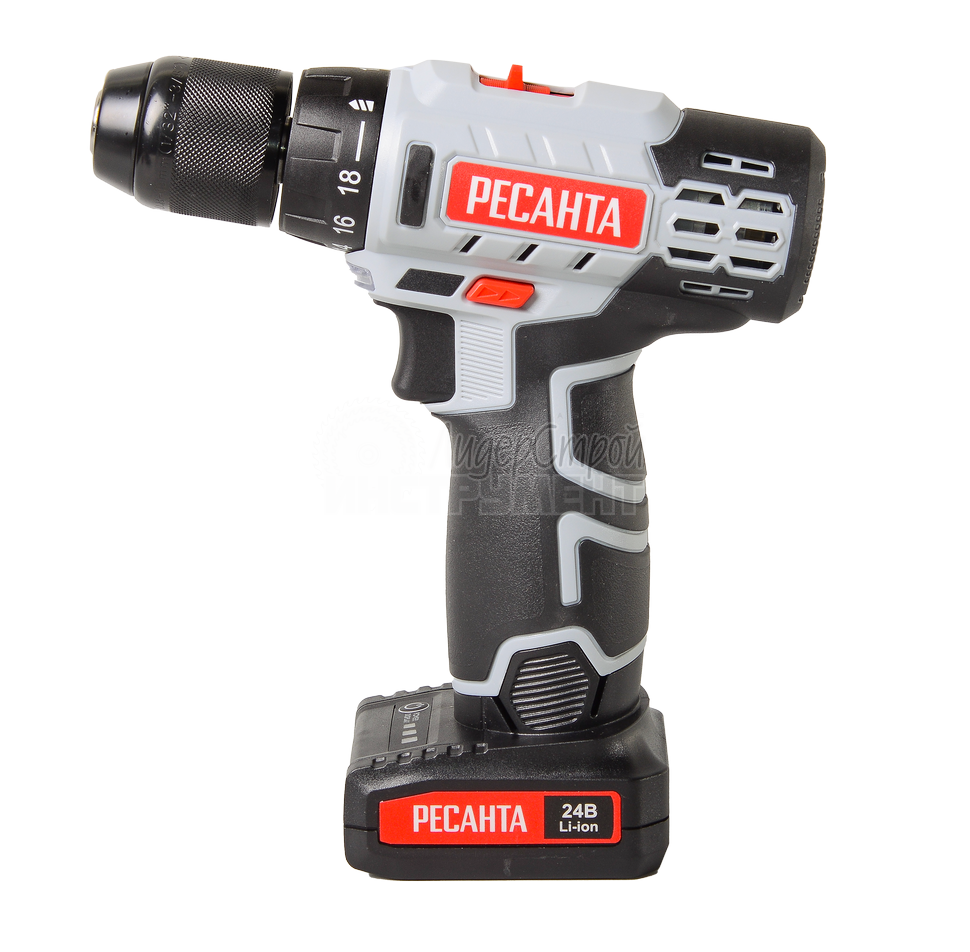 Дрель-шуруповерт аккумуляторная ДА-24-2ЛК Ресанта – незаменимый помощник мастера в ремонте или строительстве. Электроинструмент является аналогом модели ДА-24Л-2, отличие: есть кейс и второй аккумулятор. Прибор аккуратно сверлит отверстия на поверхностях из дерева и металла, а также накрепко закручивает шурупы. В комплект к дрели-шуруповерту поставляется удобный кейс, в котором можно хранить инструмент, зарядку к нему и другие рабочие детали. Не требует подключения к сети, что позволяет использовать ее в помещениях, где нет доступа к системе электропитания. Рабочие элементы легко заменить благодаря быстрозажимному патрону. Для ослабления креплений и выкручивания шурупов есть обратный ход. Форма рукоятки удобная, с резиновыми вставками, не скользит в руке. Система охлаждения мотора за счет вентиляционных отверстий на корпусе. Щёточный двигатель, две скорости (0-400 об/мин и 0-1400 об/мин). Модель работает от надёжного литий-ионного аккумулятора (Li-Ion).