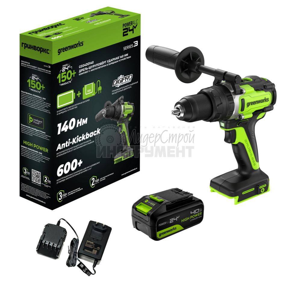 Дрель-шуруповерт ударная аккумуляторная GREENWORKS GD24DD140 1х4Ah 3707607CUB (отзывы)