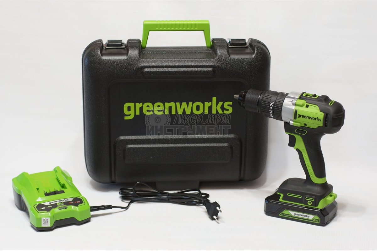 Комплект Greenworks GD24DD60K2: дрель шуруповёрт аккумуляторный, аккумулятор 24V 2 АЧ, зарядное устройство, пластиковый кейс.