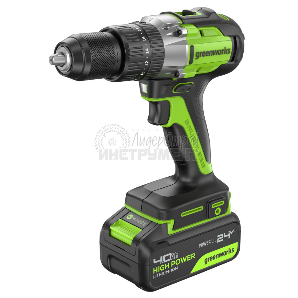 Дрель-шуруповерт ударная аккумуляторная Greenworks GD24DD60, 24V, б/щет, 30/60Нм, 1х4Ач, ЗУ — инструмент с тремя рабочими режимами для работ в мастерской или на стройплощадке: сверление с ударом (ударная дрель), сверление без удара и заворачивание/отворачивание метизов.