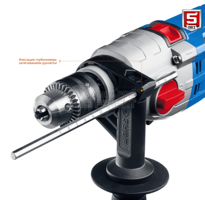 Универсальный инструмент для сверления отверстий в различных материалах (дерево, сталь и т. д.). Профессиональная дрель с мощным двигателем, надежным ударным механизмом, продуманной эргономикой и удобной дополнительной рукояткой