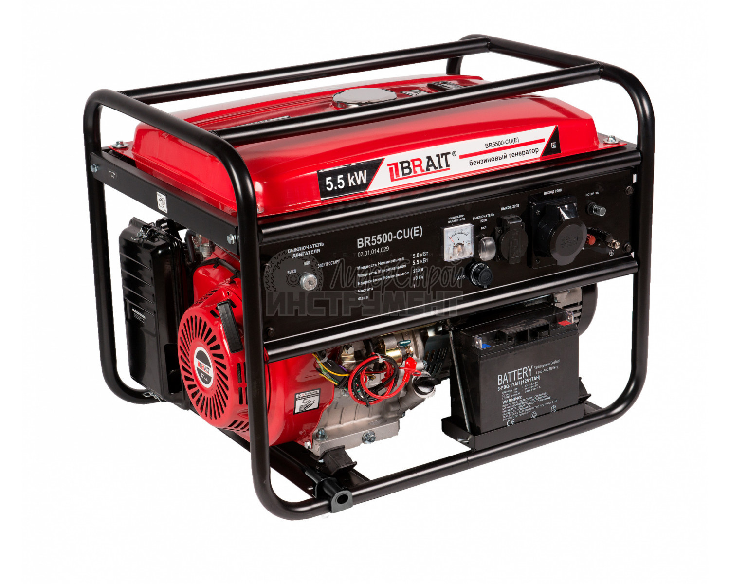 BR-5500CU(Е) оснащен четырехтактным бензиновым двигателем, работающим на бензине АИ-92. Обладает мощностью 13 лошадиных сил и имеет воздушное охлаждение. Емкость бака для топлива - 25 литров. Полной проверки будет достаточно на несколько часов беспрерывной работы при среднем уровне нагрузки. На корпусе генератора размещены две розетки 32А и 16А. Медная генерация включает срок службы генератора
