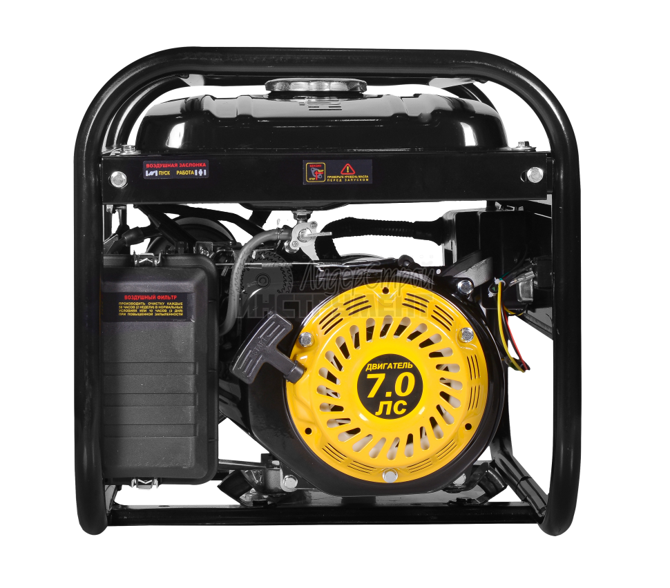 Четырехтактный бензиновый двигатель (2,8 кВт) отличается повышенной износостойкостью и производительностью. Вместительный топливный бак (12 л) обеспечивает длительную работу без дозаправки. Воздушное охлаждение деталей предотвращает скопление пыли и перегревание устройства. Системы автоматического отключения и стабилизации напряжения позволяют работать без перебоев и поломок. Металлическая рама обеспечивает защиту внутреннего механизма от повреждений.