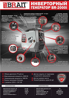 Инверторный бензиновый генератор BRAIT BR-2000i представляет собой мобильный туристический генератор. Используется в качестве резервного источника питания на даче и для питания электроприборов на пикнике. Двигатель отличается низким расходом топлива и высоким ресурсом работы. Агрегат характеризуется низким уровнем шума, что позволяет устанавливать генератор в непосредственной близости от потребителя. Корпус защищает все внутренние элементы от механических повреждений.