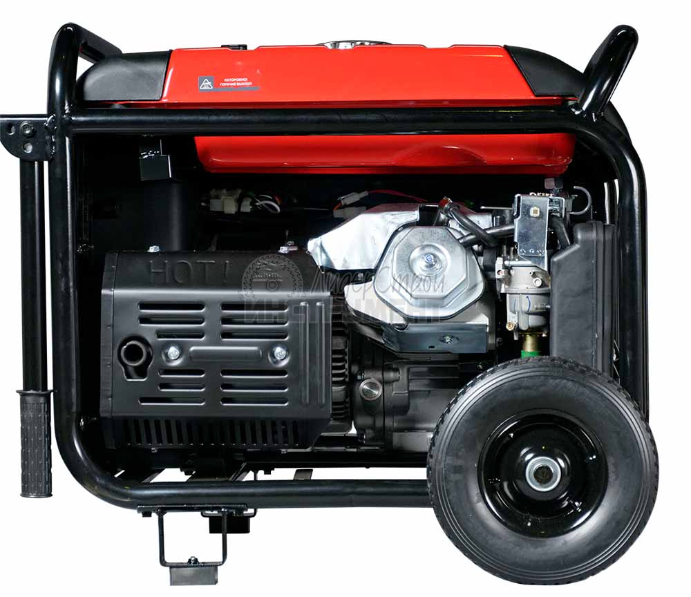 Четырехтактный бензиновый двигатель (2,8 кВт) отличается повышенной износостойкостью и производительностью. Вместительный топливный бак (12 л) обеспечивает длительную работу без дозаправки. Воздушное охлаждение деталей предотвращает скопление пыли и перегревание устройства. Системы автоматического отключения и стабилизации напряжения позволяют работать без перебоев и поломок. Металлическая рама обеспечивает защиту внутреннего механизма от повреждений.