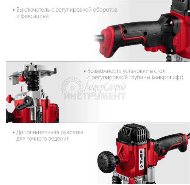 Фрезер ЗУБР – многофункциональное изделие для различных видов фрезерования (продольного, фигурного, по шаблону, по радиусу). Компактный и производительный инструмент с удобной эргономикой. Повышенная точность оперирования позволяет выполнять наиболее тонкие работы. Яркая подсветка места фрезерования способствует удобству в работе