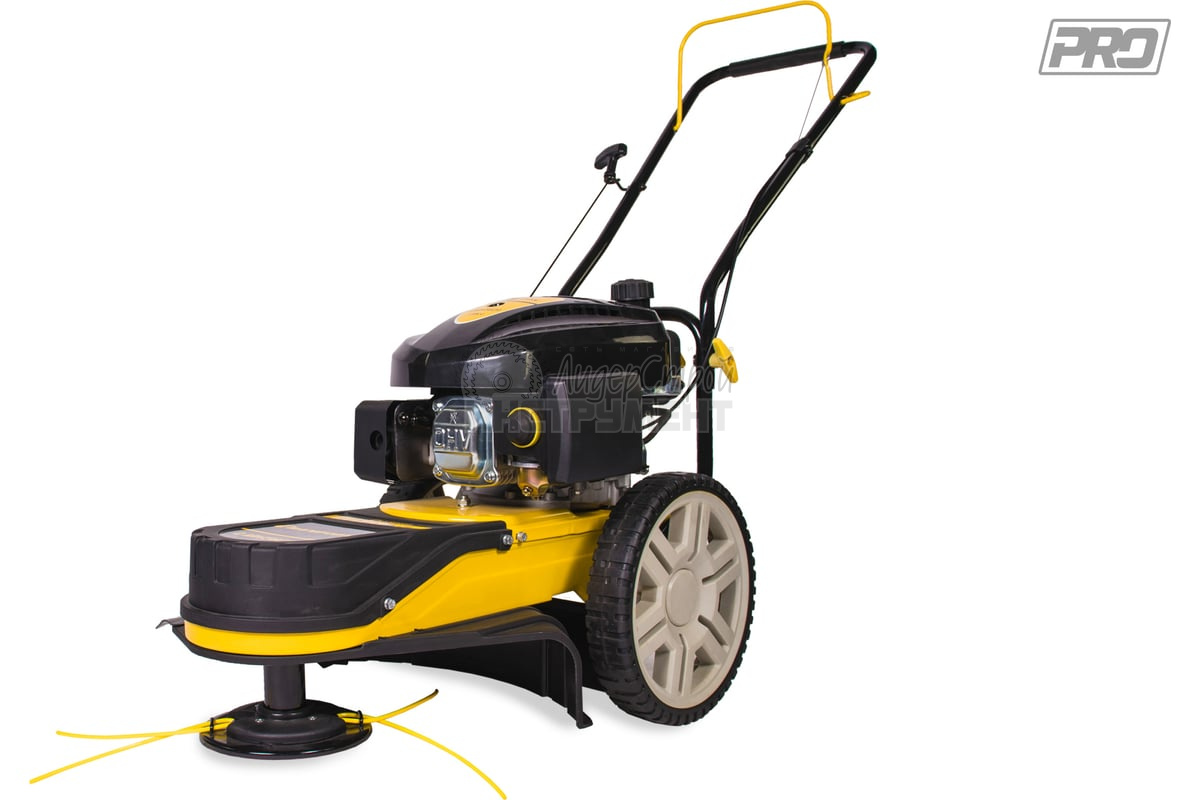 Огромные колеса газонокосилки установлены на шарикоподшипники, для плавности хода. Третьей точкой опоры является косильная стальная головка в форме полусферы. В косильную головку заряжаются отрезки лески максимального диаметра. Двигатель Champion работает на чистом бензине за счет четырех тактов работы. Масло заливается в отдельный картер и меняется через определенные сервисные промежутки.