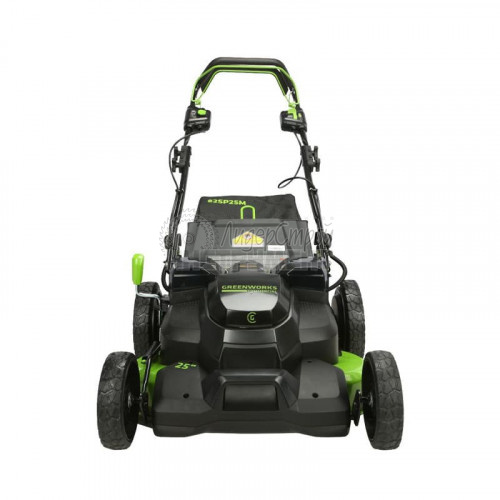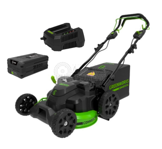 Газонокосилка самоходная аккумуляторная Greenworks GC82LM61S 82V TwinForce — мощная профессиональная газонокосилка с двумя двигателями, двумя слотами для аккумуляторов и самоходной функцией. Идеально подойдет для обработки больших площадей.