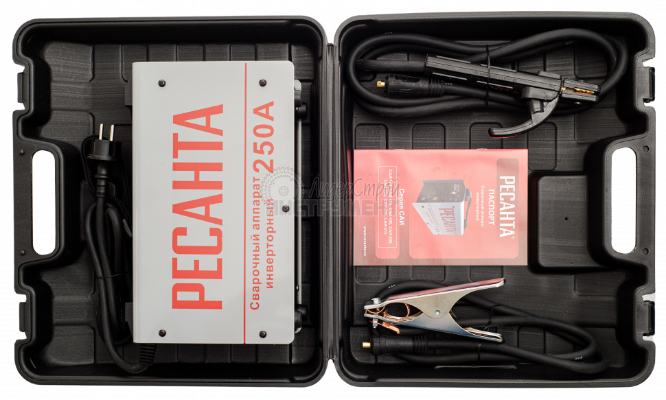 кейс, кабель с электрододержателем 1 шт., кабель с клеммой заземления 1 шт., инструкция