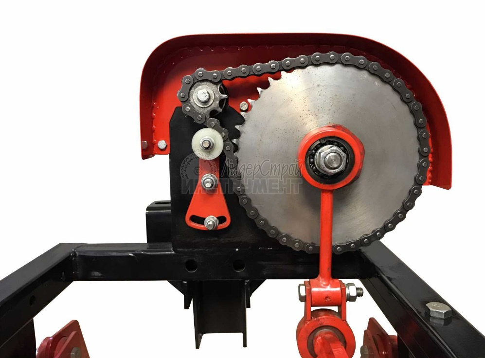 Привод осуществляется через телескопический кардан с мягкими резиновыми муфтами. При такой конструкции допускаются перекосы мотоблока относительно копалки.