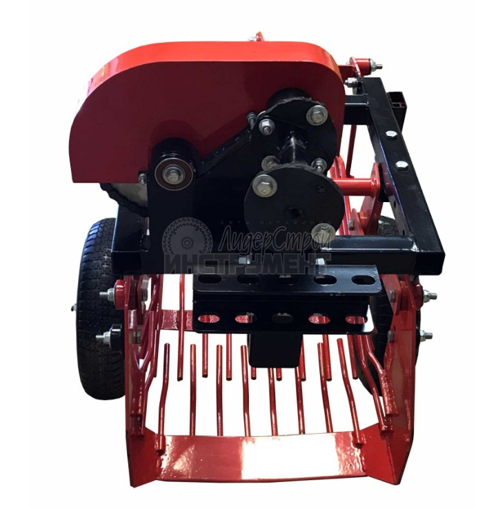 Вибрационная картофелекопалка - активное навесное оборудование для мотоблоков. Предназначена для механизированного выкапывания картофеля, отделения клубней от земли и укладки на поверхность для дальнейшего ручного сбора. Также возможна уборка лука, свеклы, чеснока и моркови типа шантане. Подключается к шкиву мотоблока через ремень.