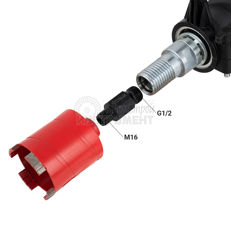 Предназначен для установки алмазного подрозетника с внутренней резьбой М16 на сверлильную машину с внутренней резьбой G1/2, может применяться с центровочным сверлом с конусным хвостовиком.