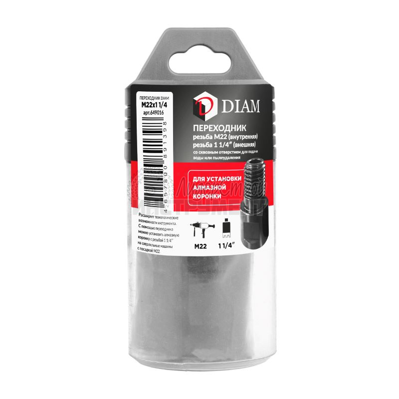 Переходник DIAM для крепления подрозетника на сверлильную машину. Расширяет технологические возможности инструмента. С помощью переходника можно установить алмазную коронку с резьбой 1 1/4 на сверлильные машины с посадкой М22.