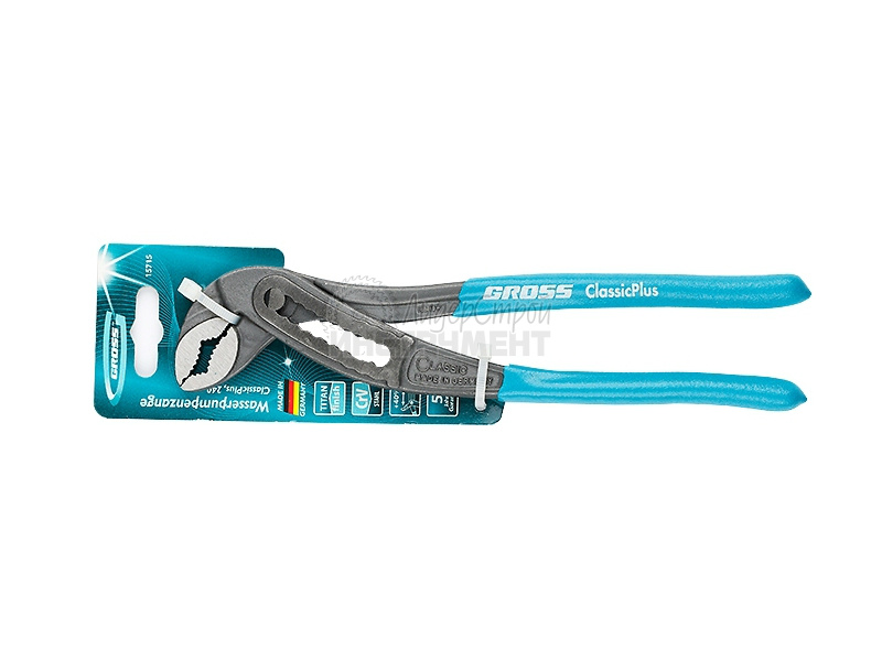 Клещи переставные торговой марки GROSS предназначены для вращения и фиксации труб, фитингов и прочих слесарно-монтажных работ. На зажимных поверхностях губок присутствует паз для захвата и удержания гвоздей, проволоки. За счет небольшого изгиба направляющих и смешения нижней рукоятки относительно шарнира можно осуществлять уверенный захват предметов размером до 50 мм. Изготовлены клещи из инструментальной хромованадиевой стали (CrV). Твердость рабочих частей составляет 55–59 HRC. Обливные обрезиненные рукоятки позволяют надежно удерживать инструмент в руке и предохраняют пальцы от случайного защемления. Подвесная карта обеспечивает удобное размещение на стенде. На инструмент распространяется пятилетняя гарантия.