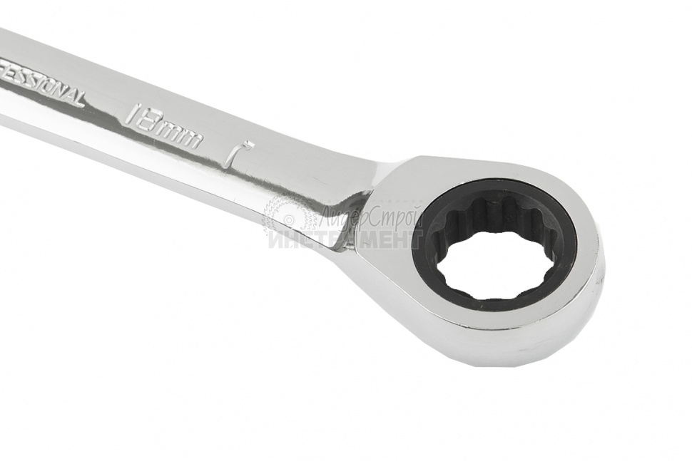 Ключ изготовлен из высококачественной стали 40CrV1. Имеет хромоникелевое антикоррозионное покрытие. Твердость материала храпового механизма 58 HRс. Профиль накидной части ключа имеет 12 граней, что увеличивает площадь соприкосновения рабочих поверхностей и снижает риск деформации граней крепежа при монтаже. В кольцевой профиль ключа установлен специальный храповый механизм (трещотка) с 72 зубцами, который обеспечивает легкий ход инструмента, быстрый и удобный монтаж резьбовых соединений. Минимальный угол поворота ключа 5 градусов. Ключ гаечный комбинированный с трещоткой предназначен для эффективного откручивания или закручивания болтовых соединений.