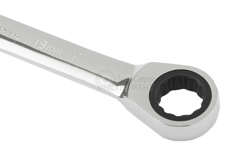 Ключ изготовлен из высококачественной стали 40CrV1. Имеет хромоникелевое антикоррозионное покрытие. Твердость материала храпового механизма 58 HRс. Профиль накидной части ключа имеет 12 граней, что увеличивает площадь соприкосновения рабочих поверхностей и снижает риск деформации граней крепежа при монтаже. В кольцевой профиль ключа установлен специальный храповый механизм (трещотка) с 72 зубцами, который обеспечивает легкий ход инструмента, быстрый и удобный монтаж резьбовых соединений. Минимальный угол поворота ключа 5 градусов. Ключ гаечный комбинированный с трещоткой предназначен для эффективного откручивания или закручивания болтовых соединений.