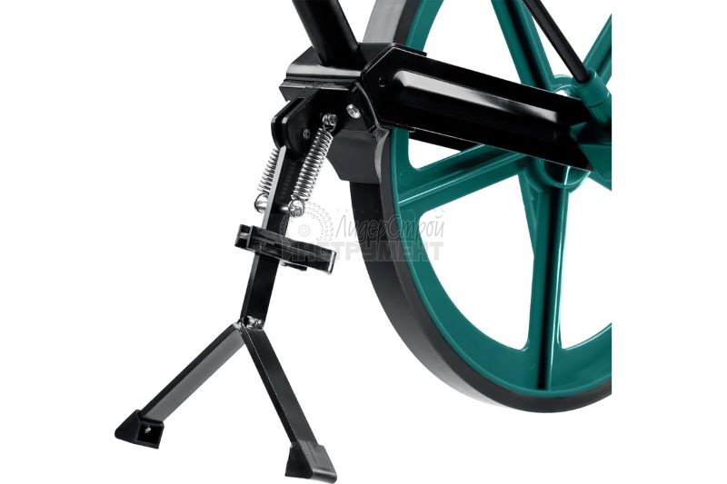 Результаты можно фиксировать на дисплее и сохранять в памяти прибора. Телескопическая ручка быстро раскладывается в рабочее положение. Фиксируется с помощью клипс. В сложенном состоянии колесо удобно транспортировать к месту работ. Для установки колеса в вертикальном положении при перерыве в работе есть откидная металлическая подножка.