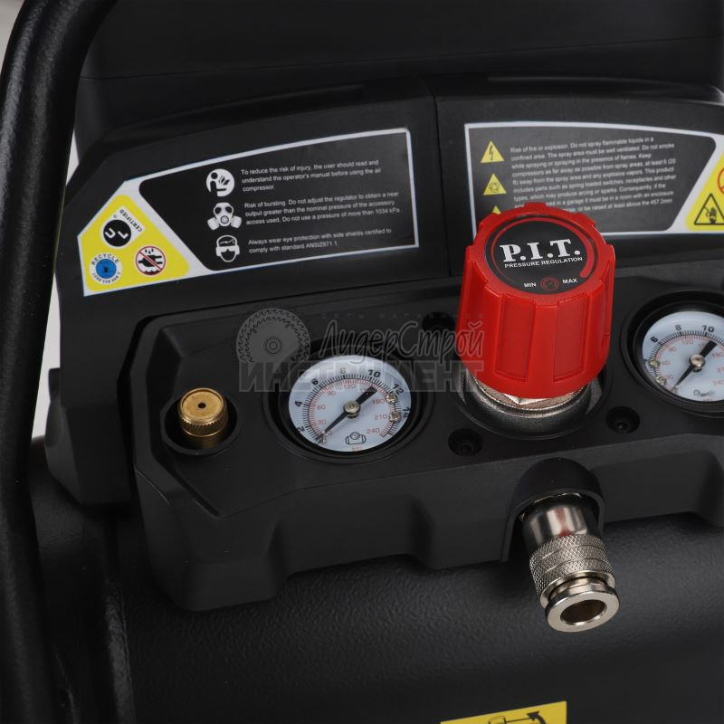 Регулировка давления на выходе для удобства использования и два манометра для контроля давления в ресивере и на выходе.