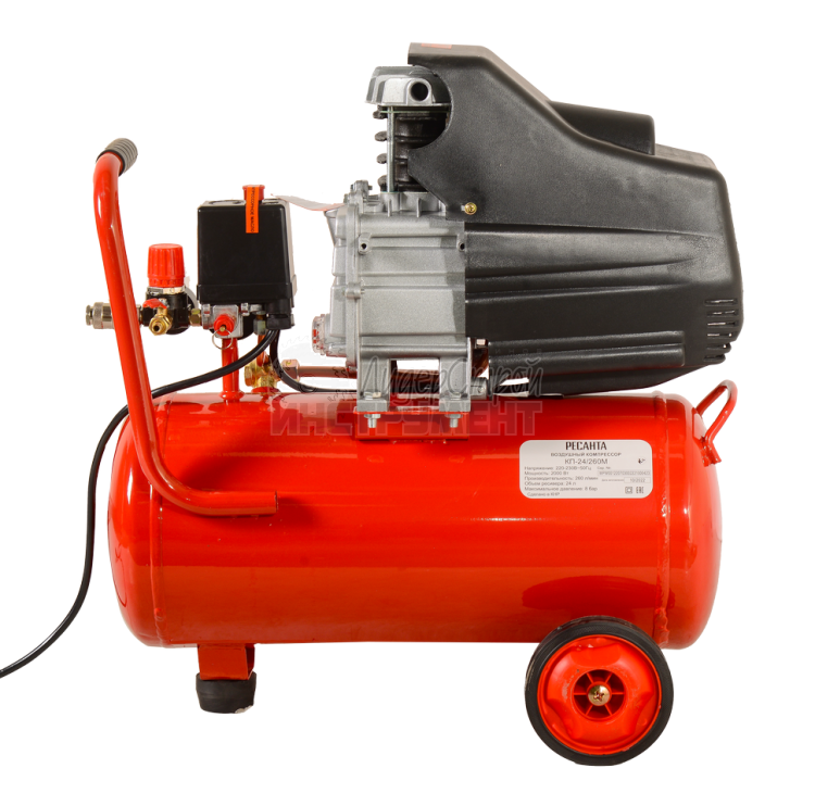 Модель воздушного компрессора Ресанта КП-24/260М является механическим устройством, которое предназначено для создания потока воздуха под высоким давлением, необходимого для работы пневмоинструментов и оборудования. Агрегат состоит из двигателя, горизонтального ресивера и регулирующей аппаратуры. Он относится к категории поршневых масляных агрегатов, имеющих прямую передачу. Номинальная мощность модели Ресанта КП-24/260М составляет 2кВт. Производительность – 260л/мин. Объём ресивера – 24 л. Величина создаваемого давления – 8 бар.