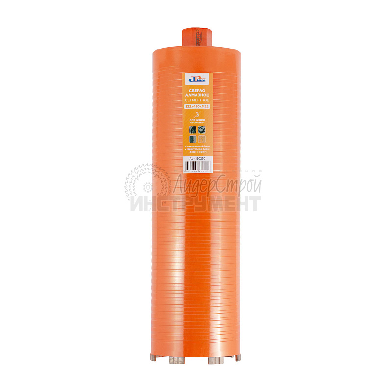 Алмазные сверла с лазерной сваркой сегментов для сухого сверления армированного бетона, бетона, строительных блоков, кирпича, пенобетона. Сверла имеют стандартную рабочую длину 450 мм, крепление -резьба М22, на корпусе нанесена спиральная выточка для более легкого сверления и дополнительного отвода пыли при сверлении, турбо сегмент высотой 10 мм обеспечивает быстрое сверление твердых материалов. Лазерная сварка сегментов обеспечивает высокую надежность коронки во время эксплуатации и минимизирует возможность отрыва сегмента во время сверления. Сверла имеют хорошее соотношение ресурса и цены. Сухое сверление следует производить с использованием системы пылеудаления и строительного пылесоса. Возможно использовать сверла для сверления с подачей воды, при этом ресурс может сократиться до 50%.
