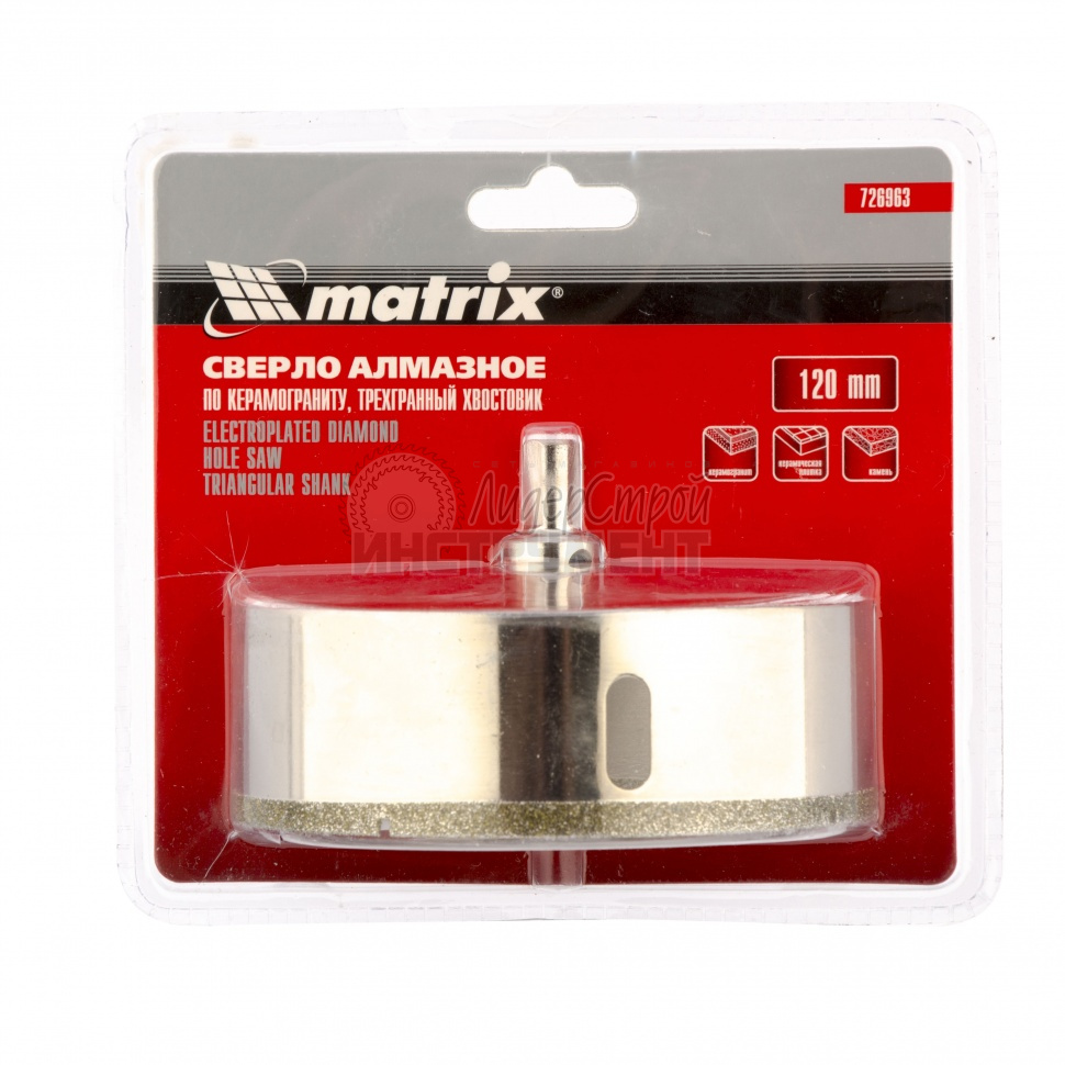 Универсальное алмазное сверло по керамограниту Matrix 726963, 120 x 67 мм, с 3-гранным хвостовиком, применяется для сверления стекла, плитки, кафеля. А за счет высокой концентрации алмазов в режущем слое оно легко справляется с выполнением отверстий в керамограните. Сверло рассчитано на профессиональное использование с дрелями и шуруповертами. Водяное охлаждение в процессе работы значительно повысит срок его службы.
