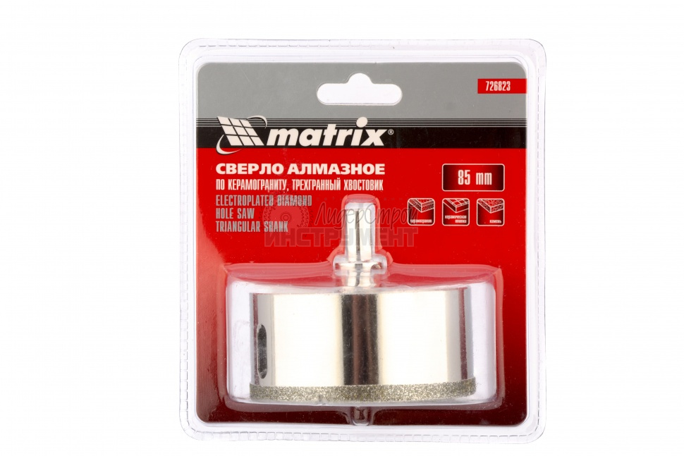Универсальное алмазное сверло по керамограниту Matrix 726823, 85 x 67 мм, с 3-гранным хвостовиком, применяется для сверления стекла, плитки, кафеля. А за счет высокой концентрации алмазов в режущем слое оно легко справляется с выполнением отверстий в керамограните. Сверло рассчитано на профессиональное использование с дрелями и шуруповертами. Водяное охлаждение в процессе работы значительно повысит срок его службы.