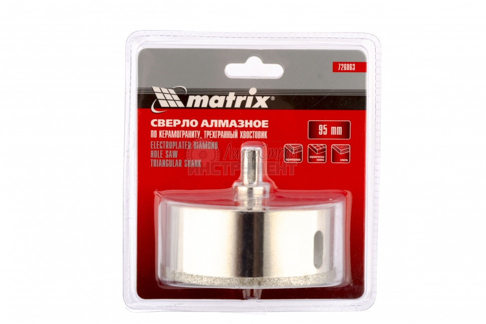 Универсальное алмазное сверло по керамограниту Matrix 726863, 95 x 67 мм, с 3-гранным хвостовиком, применяется для сверления стекла, плитки, кафеля. А за счет высокой концентрации алмазов в режущем слое оно легко справляется с выполнением отверстий в керамограните. Сверло рассчитано на профессиональное использование с дрелями и шуруповертами. Водяное охлаждение в процессе работы значительно повысит срок его службы.