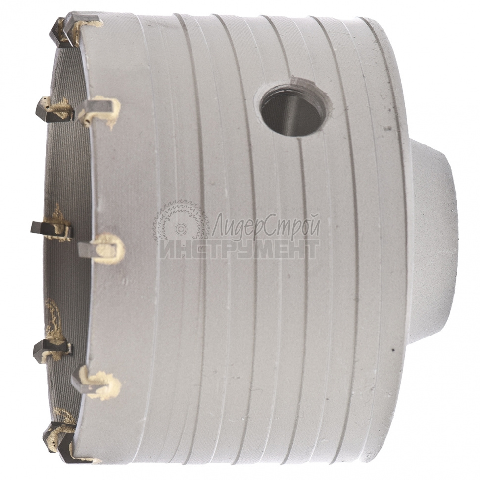 Твердосплавные зубья из сплава марки ВК8. Корпус коронки изготовлен из углеродистой стали. Хвостовик SDS-PLUS. Резьбовое крепление коронки к хвостовику. На внешней стороне коронки нарезана спиральная канавка для улучшения вывода продуктов сверления и снижения нагрузки на перфоратор.