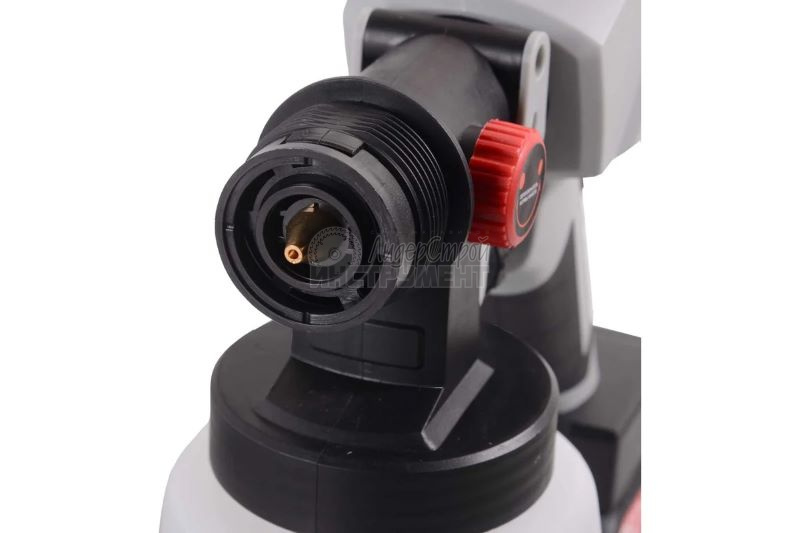 Мощность устройства (550 Вт) позволяет интенсивно работать продолжительное время. Благодаря системе HVLP инструмент обеспечивает точное распыление даже в труднодоступных местах. Работает как в вертикальном, так и горизонтальном положении за счет регулируемого дозатора. Сопло разбирается, что способствует легкой очистке деталей прибора. Эргономичная рукоятка облегчает управление.
