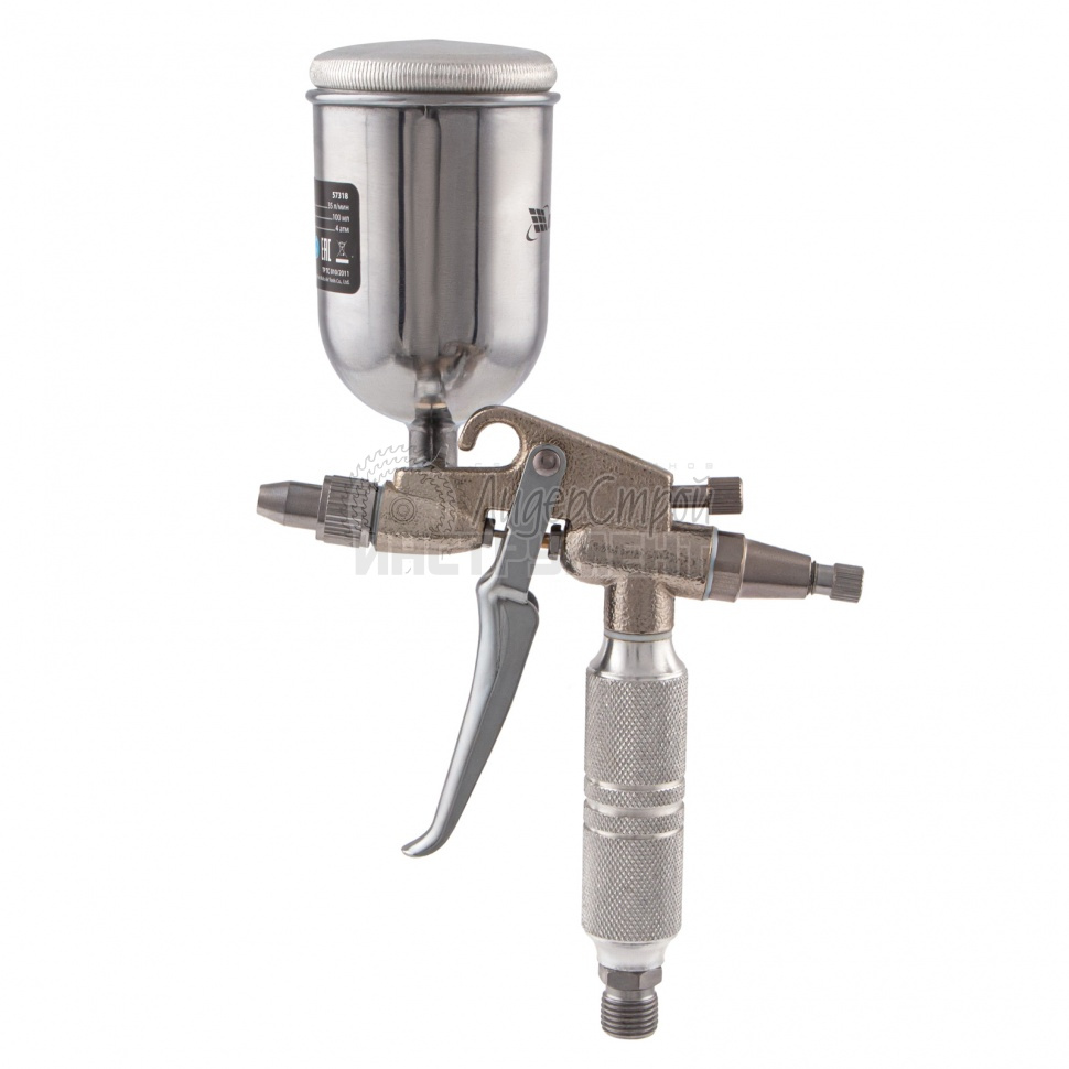 Универсальный качественный краскораспылитель (артикул 57318) используется для проведения чистовых работ. Подходит для тонкой работы, где требуется высокая точность нанесения краски. Для использования необходимо подключение компрессора, подающего сжатый воздух.