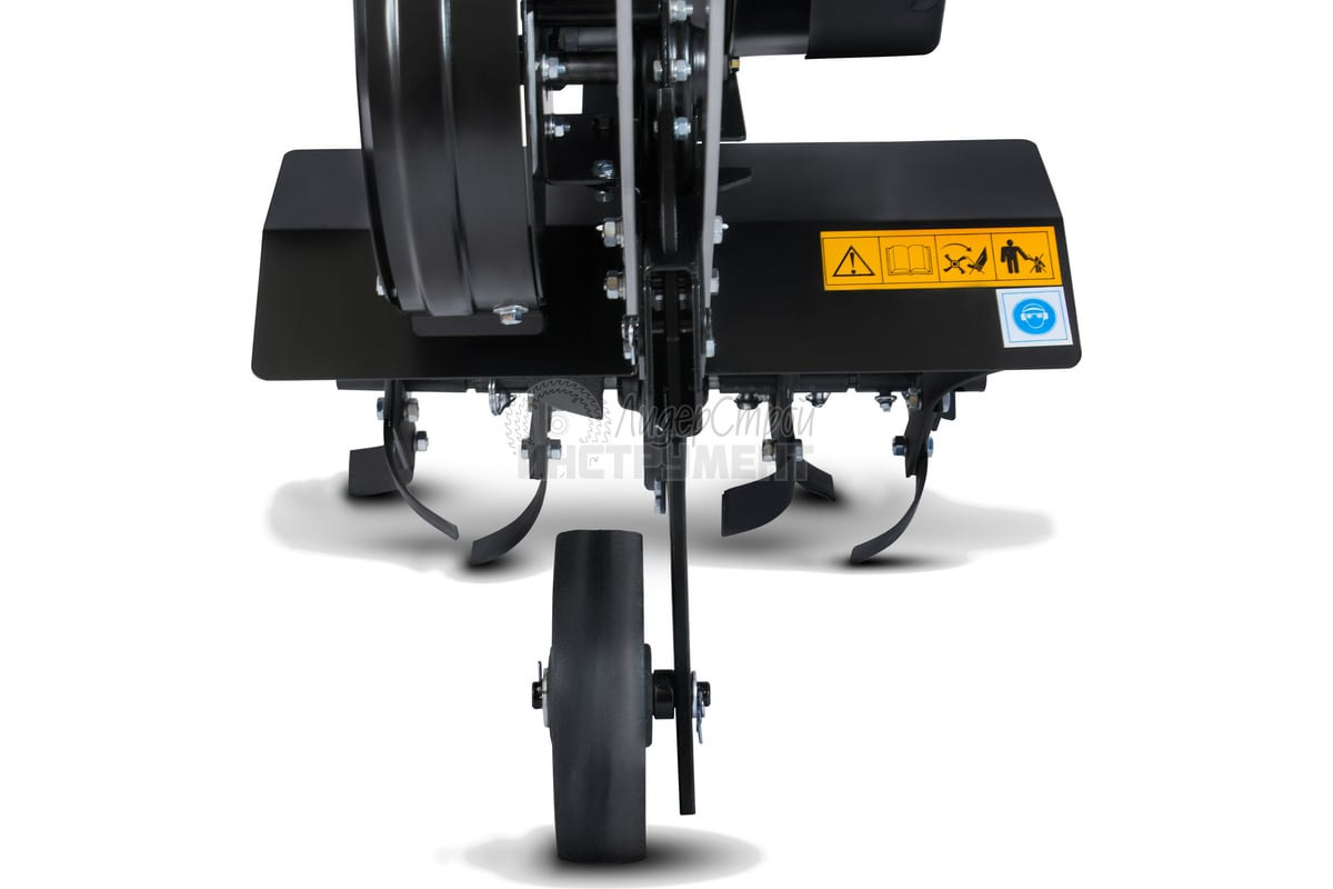 - Благодаря транспортировочному колесу культиватор легче перевозить по участку;