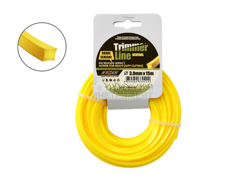 Леска триммерная (квадрат) ф3,0мм 15м General REZER Триммерная леска используется для скашивания травы с помощью мотокос. Артикул 03.007.00058.