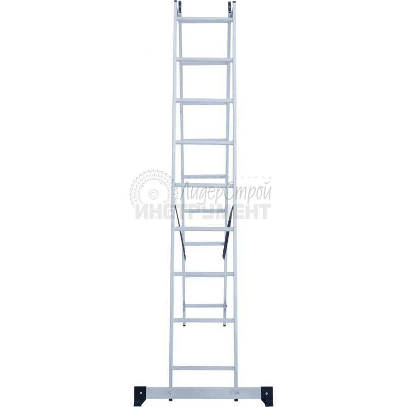 Благодаря трасформируемой конструкции принимает несколько положений: обычная лестница, стремянка, помост и Г-образное положение, подходящее для рельефных поверхностей.