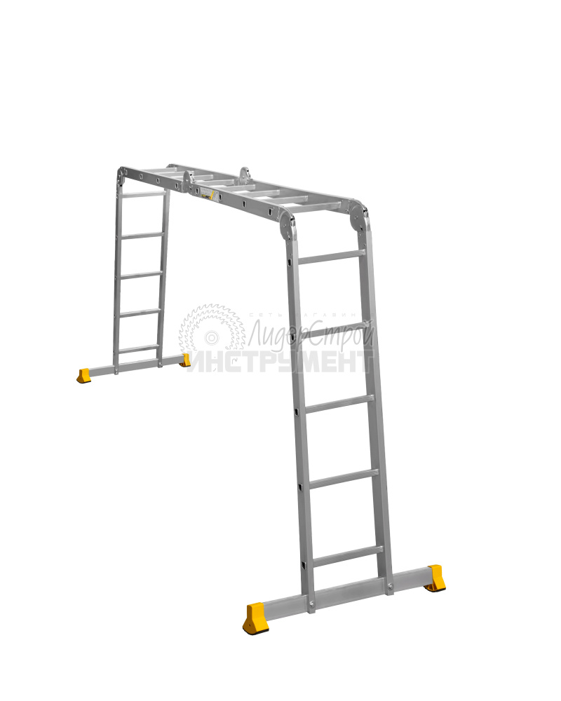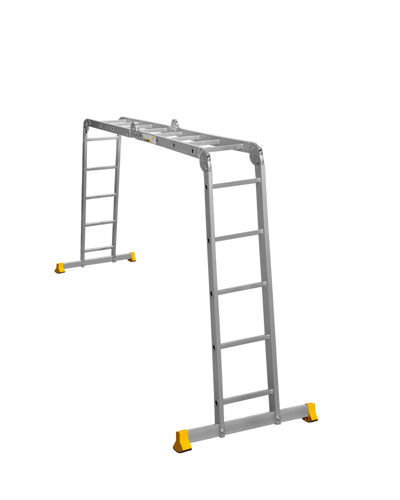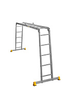 Благодаря трасформируемой конструкции принимает несколько положений: обычная лестница, стремянка, помост и Г-образное положение, подходящее для рельефных поверхностей.